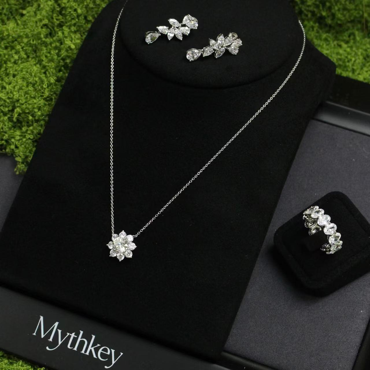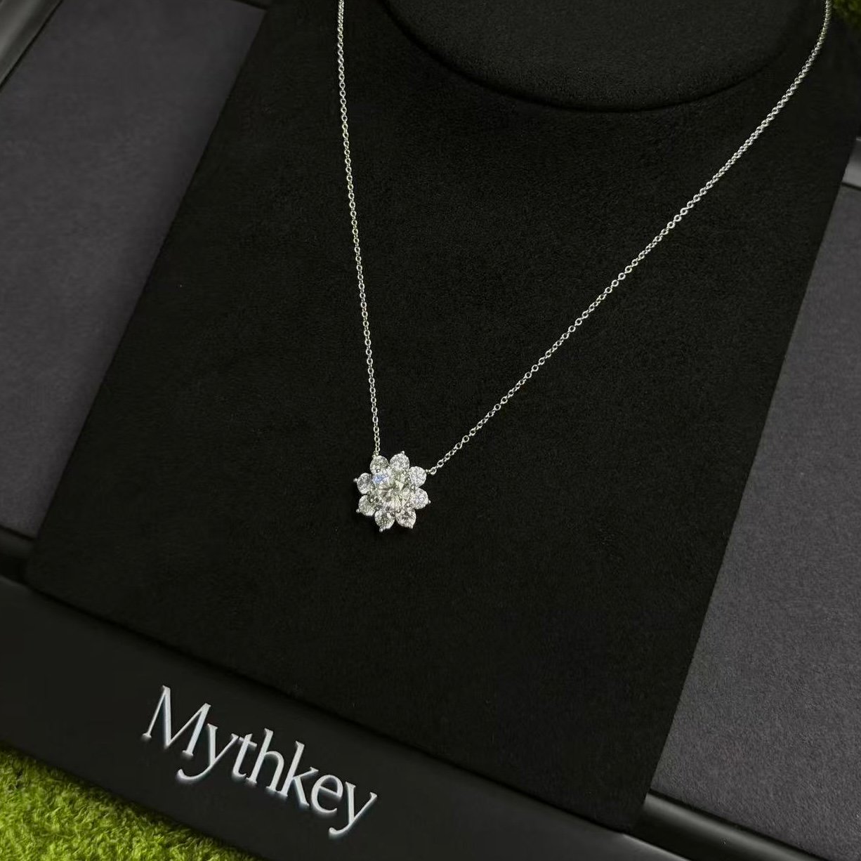 The MYTHKEY Ice Blossom captures the quiet brilliance of winter’s first snow. Inspired by the natural symmetry of a snowflake, this pendant features a 2-carat synthetic crystal at its center, surrounded by a delicate cluster of smaller stones that sparkle from every angle.