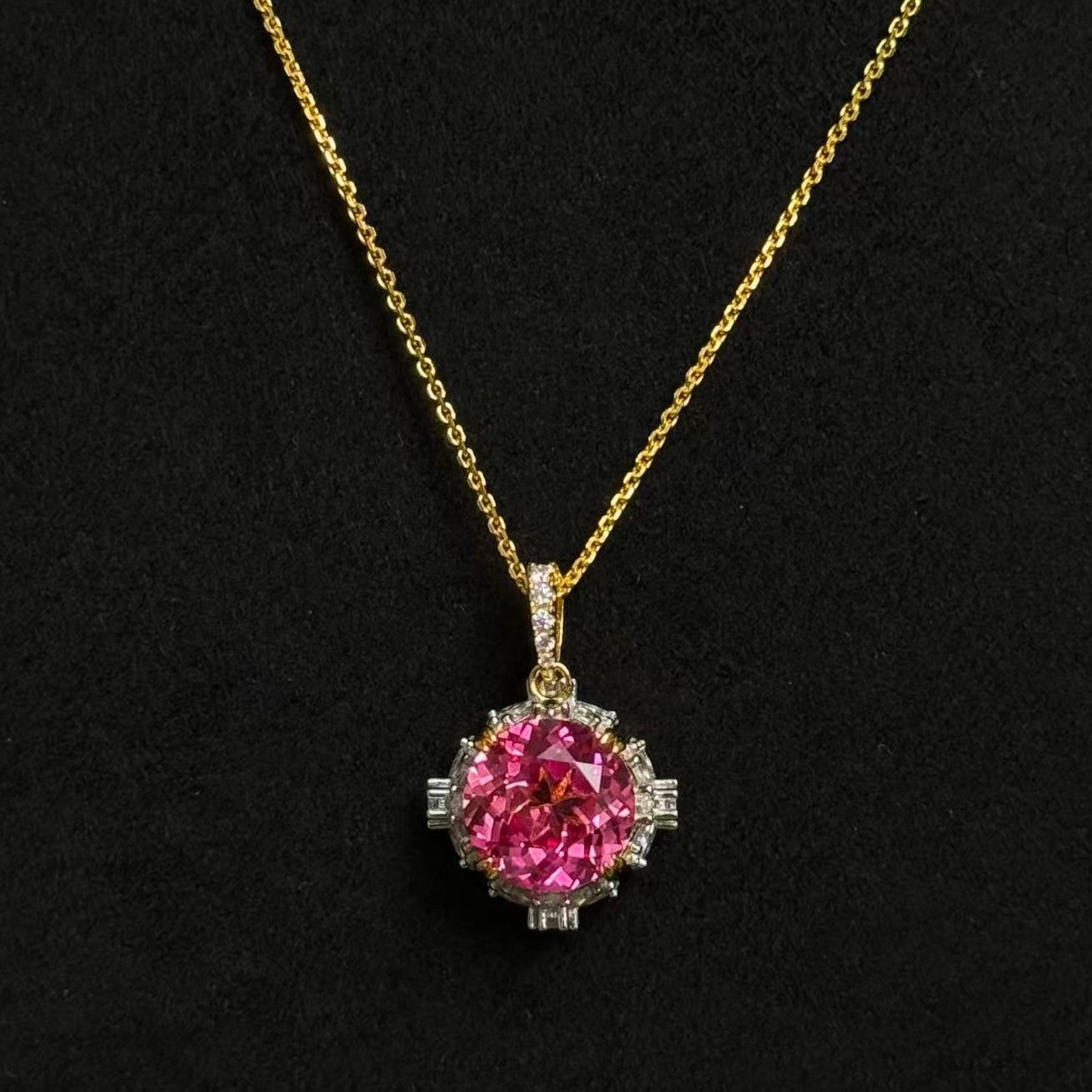 The MYTHKEY 4-Carat Padparadscha Lotus Pendant Necklace embodies unique elegance through its soft pink gemstone. The 11 mm main stone shimmers under golden light, radiating both tenderness and brilliance. With its delicate chain design that rests lightly against the skin, it complements any style—whether for daily wear, evening gowns, or vacation outfits—adding a touch of graceful sparkle to every look.
