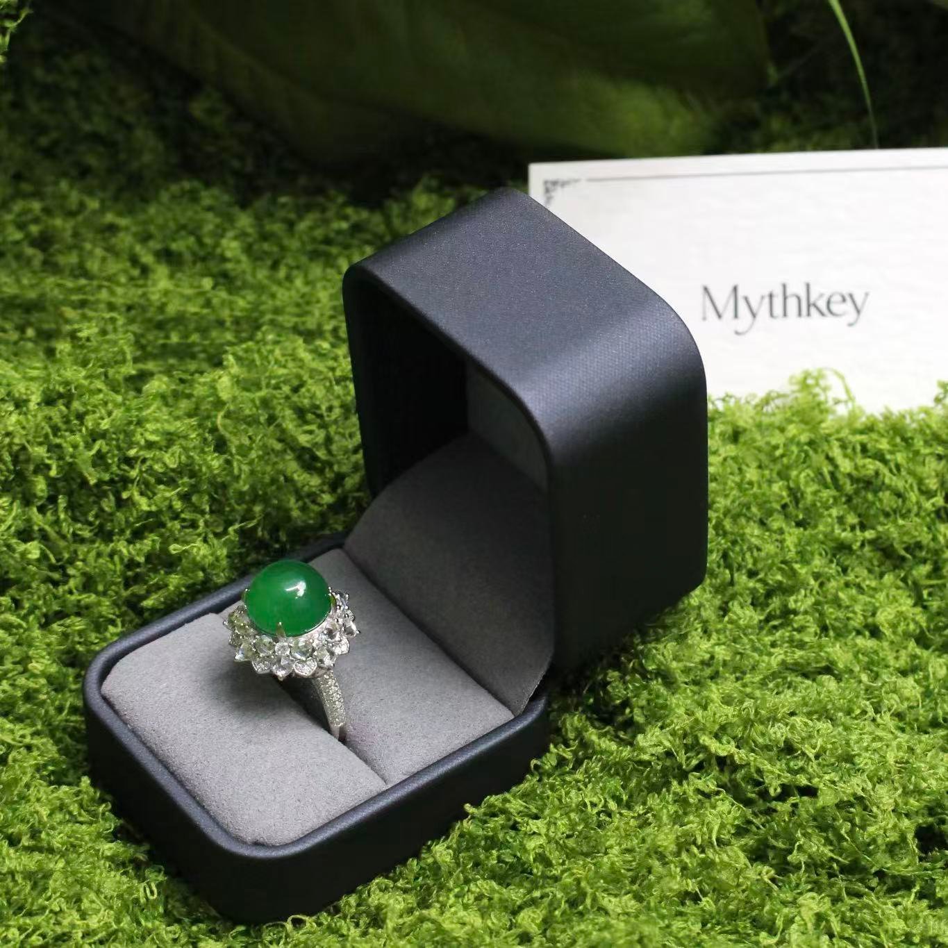 The MYTHKEY Eternal Green Ring embodies the tranquil balance between nature and light.At its heart lies a luminous 5.5-carat green chalcedony cabochon, glowing with serene vitality and depth.Encircled by a halo of brilliant diamonds, the ring reflects harmony and renewal — a tribute to timeless beauty and inner calm. It radiates enduring elegance, capturing the essence of spring in every gentle shimmer.